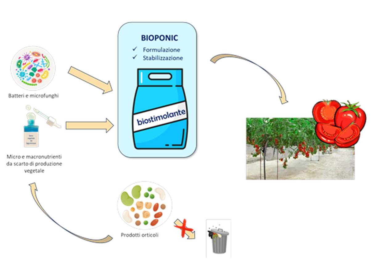 Il progetto BIOPONIC si propone di sviluppare nuove soluzioni specifiche per le colture di pomodoro in condizioni idroponiche come alternativa a fertilizzanti e prodotti convenzionali di sintesi, grazie all’esperienza maturata nei progetti Horizon Europe SIMBA e DELISOIL e alla collaborazione con Adriatica S.p.A., azienda leader nel mercato dei fertilizzanti. Microrganismi promotori della crescita delle piante (batteri e funghi), e sottoprodotti della produzione primaria saranno utilizzati come biostimolanti per la crescita di piante di interesse agronomico, favorendo processi di simbiosi industriale in un’ottica di economia circolare.